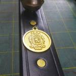 The customer decided to go in a different direction entirely. He had round brass pendants custom-made with their family name and crest. I designed small brass-wire fasteners to securely fasten the pendants onto the leather straps.